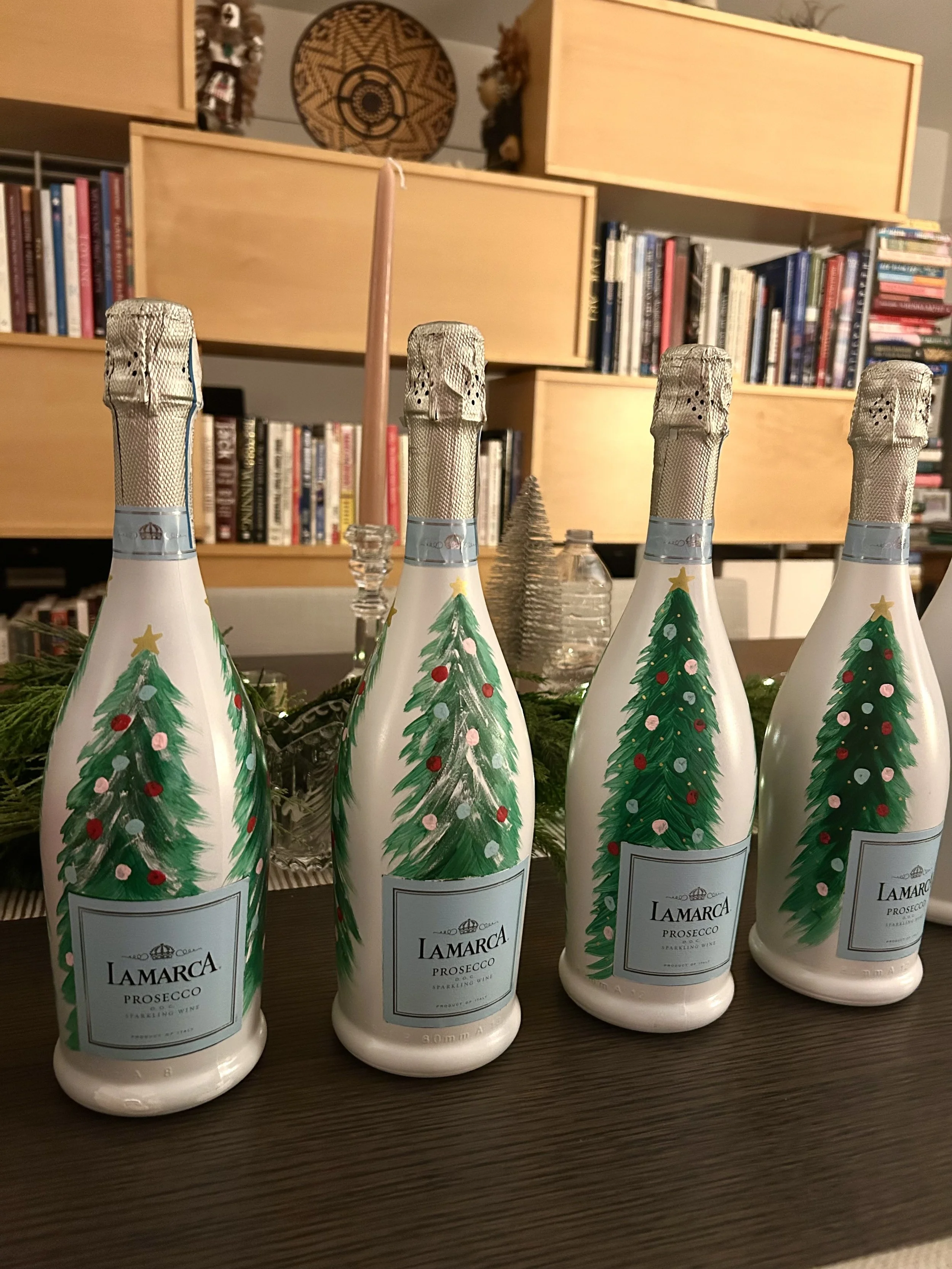 Painted Champagne Bottles Custom hand-painted champagne bottles, designs ranging from college-themed, floral-themed, holiday-themed, and more. Pricing Prosecco Champagne Bottles $55 Veuve Champagne Bottle $95 $25 Mini Prosecco/Rose Bottles For Inquiries Click Here